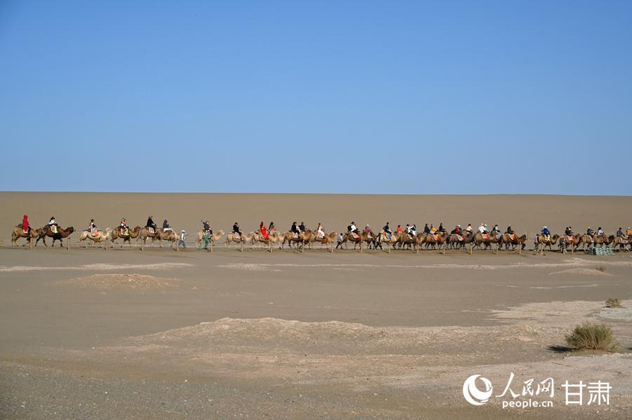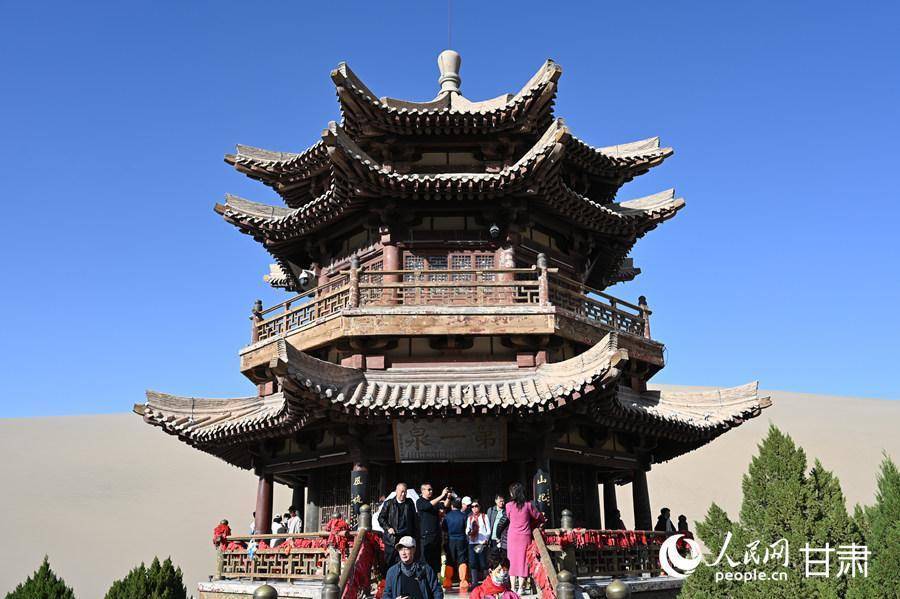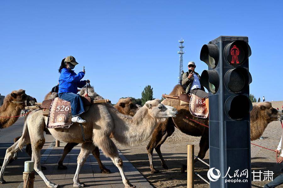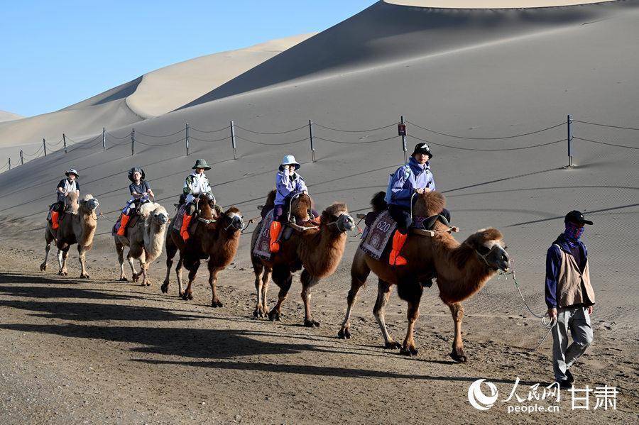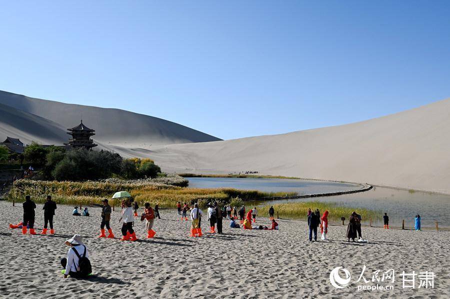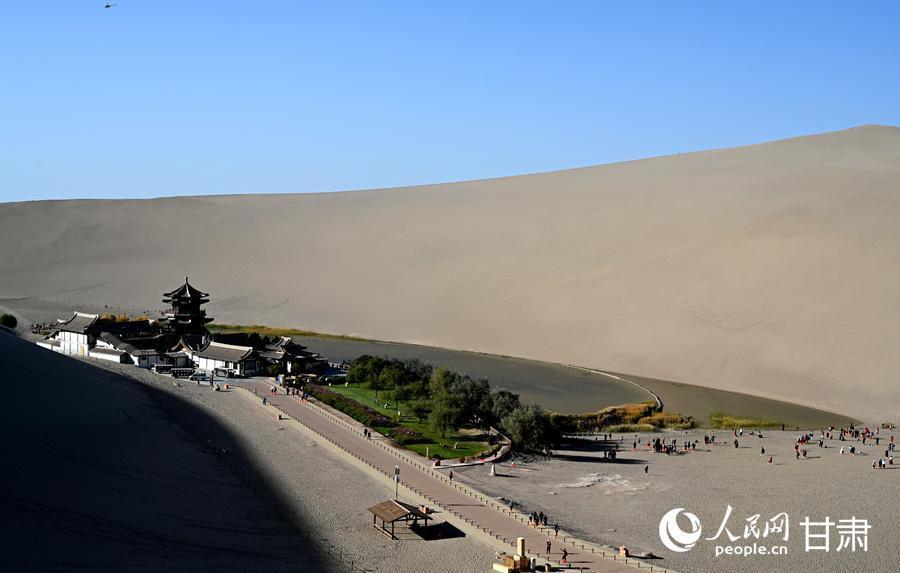 秋日的鸣沙山月牙泉景区宛如一幅浑然天成的画卷。阳光为鸣沙山镀上金辉,沙砾流光;月牙泉则静卧其间,澄澈静谧。游人徜徉泉畔,驼铃声声入耳,沉浸在大漠独有的韵味与诗意中。